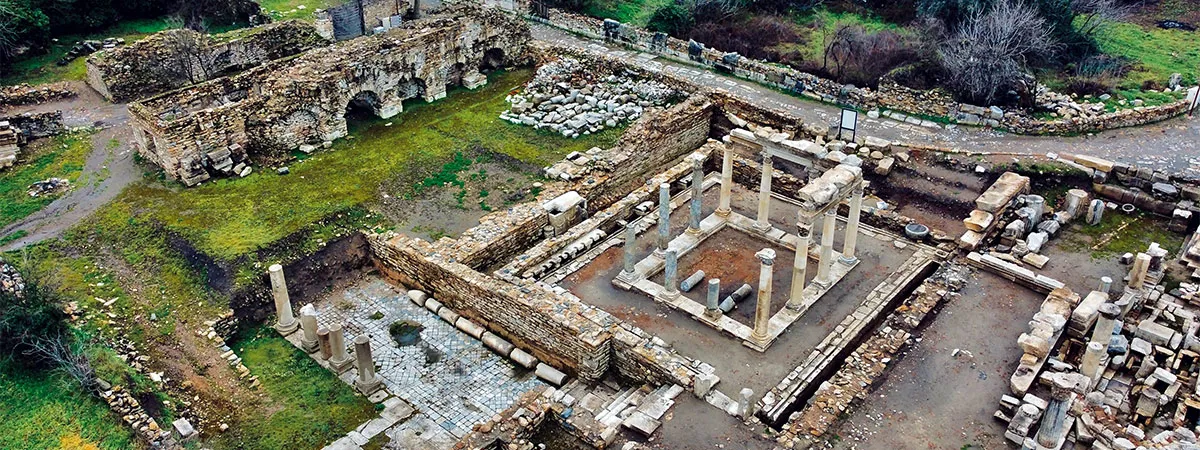 Antik kentin farklı dönemlerine ait mimari yapıların iç içe geçmiş kalıntıları